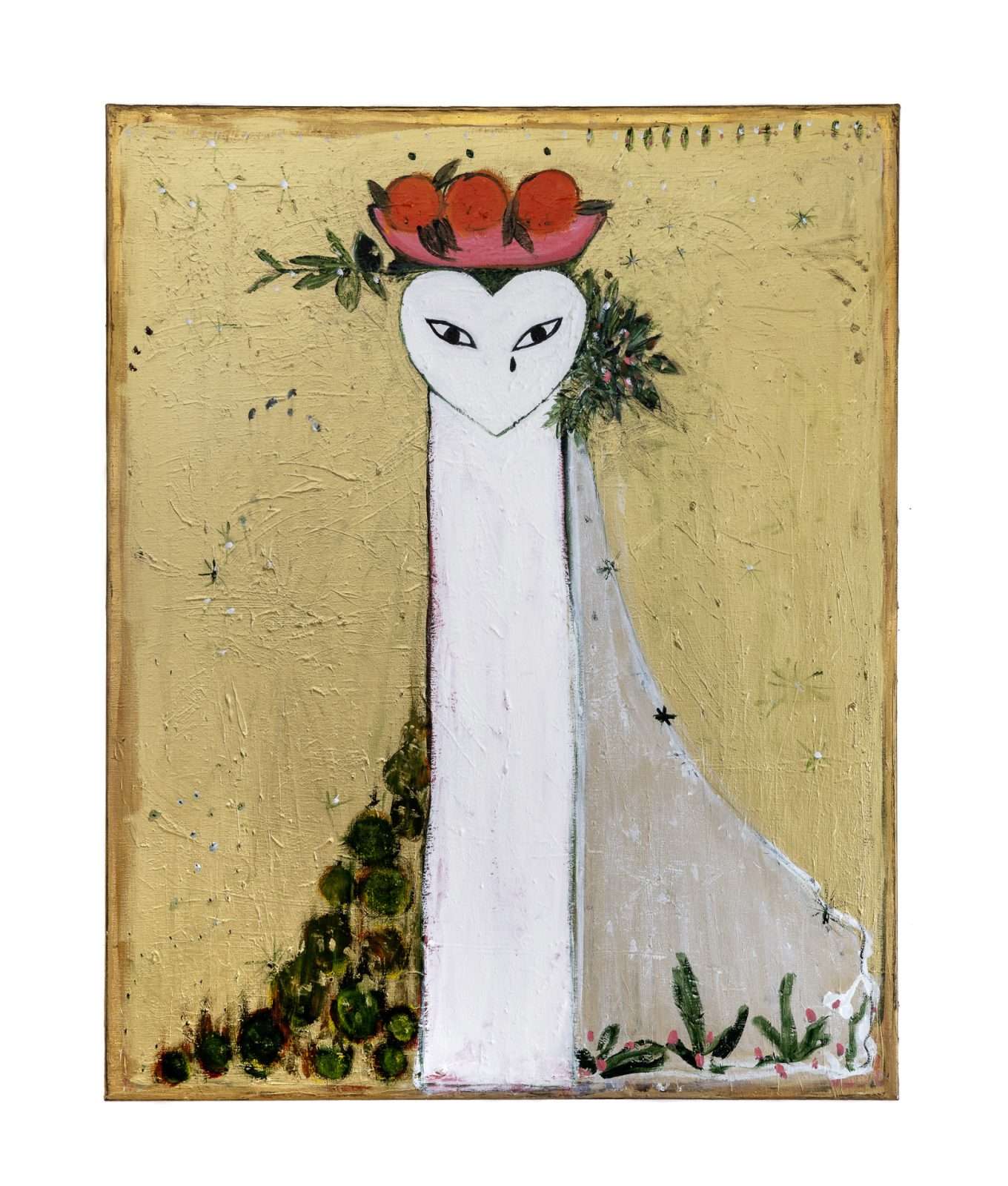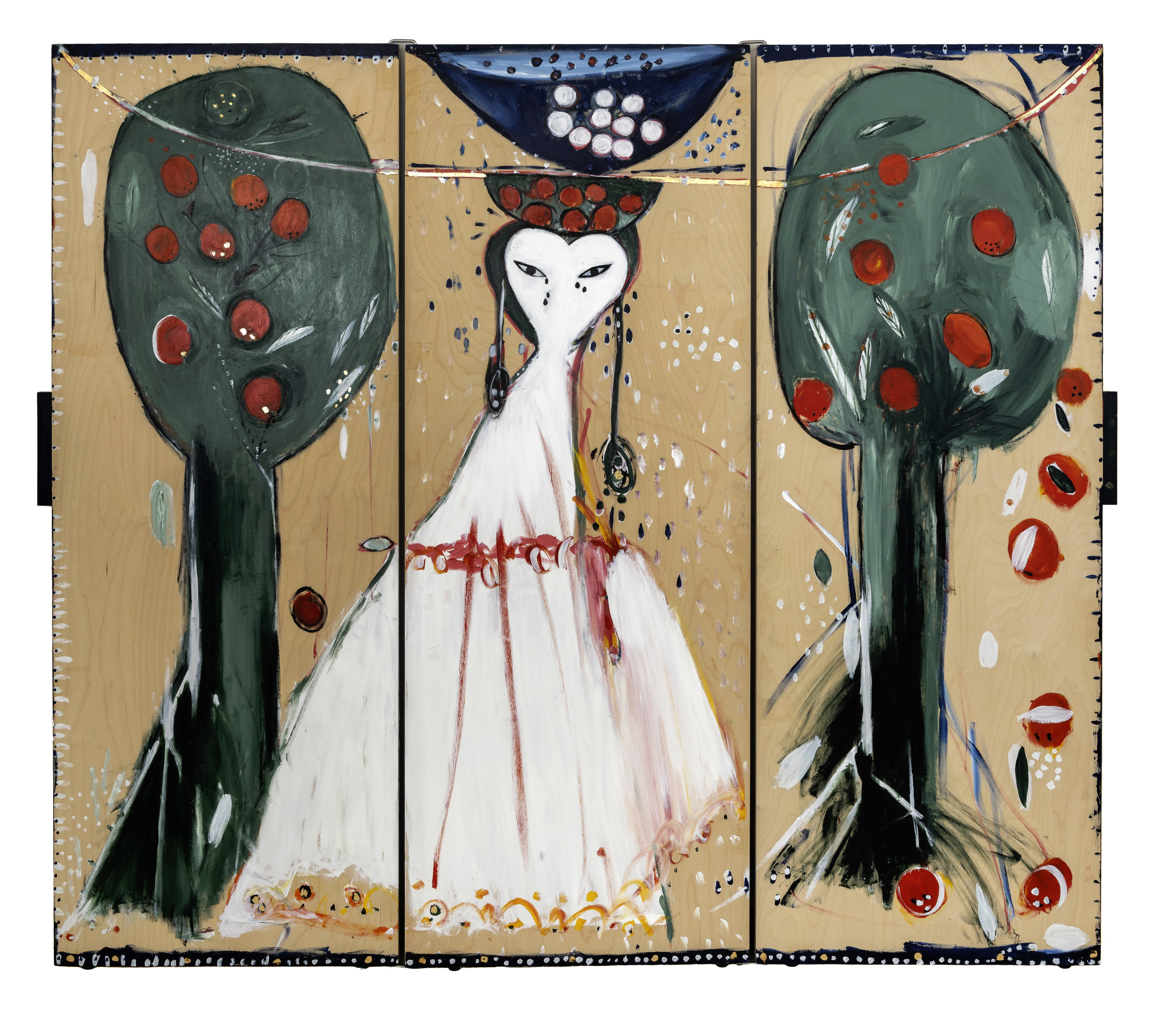 הראייה היא רגע התעוררות התודעה המקראית במשולש אדם-חווה ונחש, מחוללה ההתפכחות. “וַתֵּרֶא הָאִשָּׁה כִּי טוֹב הָעֵץ לְמַאֲכָל וְכִי תַאֲוָה הוּא לָעֵינַיִם וְנֶחְמָד הָעֵץ לְהַשְׂכִּיל וַתִּקַּח מִפִּרְיוֹ וַתֹּאכַל וַתִּתֵּן גַּם לְאִישָׁהּ עִמָּהּ וַיֹּאכַל” (בראשית ג,ו). הרגע הזה הוא רגע הפצעת המיניות ותודעת הבושה הנלווים לסיפור המקראי שכולו פיתוי ועורמה. רגע שבו נקשר גורלו של איש באישה לגירוש, תמותה וחיי סבל. את הרגע המשברי מתארת חן שיש בכפל ציורים בפרדייס שלה ובהכפלות שונות של דימויים או צמדים, ביניהם היא חורצת מחיצה, קרע, או פצע. ב’משפחה’ (2020) שתי דמויות בעלות פני לב באדום ובירוק ומעיניהן זולגות דמעות. בתווך דמות חייתית המשורטטת כבקווים רישומיים חוצצת ואינה מאפשרות את האיחוד הנחשק. גם ב”פרדייס” צד א’ (2020) ניצבות שתי ציפורים בכמעט נשיקת מקורים וביניהם מתרומם פרח פרא שחור ומאיים. בצד ב’ של “פריידס” דמות נשית בשמלה לבנה וחגיגית, שכמו נשאבה מציור פולקלור נאיבי. לראשה סלסלת פרי אדמדם, אך עיניה דומעות ושני העצים המוריקים משני עבריה ניצבים כשומרי ראש. העצב שורר בגן העדן של שיש והדמות מאזכרת את ציור “הכלה התוניסאית” (2015 ) שבה ציירה שיש דמות נשית בעלת ראש דמויי לב, עיניים מלוכסנות באופן חתולי, והיא נראית כממתינה עד בוש לבוא חתנה וכולה דמעות.