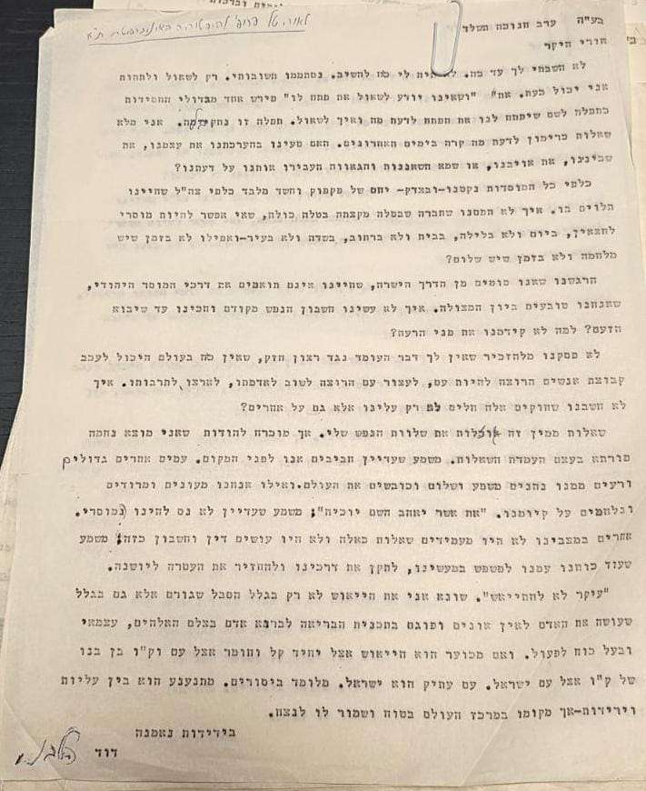 קשה לי לתאר לפניך את השמחה שקיבלתי מתוך קריאת מכתבך. ואולי אין שמחה כשמחה הבאה מתוך תיאום מחשבה. גם לי ישנם הרבה פקפוקים למה שמתרחש בישראל. אבל אין לי למי לגלות. האווירה המתוחה בכיוון האחד, אינה סובלת שום סטייה מהדרך שהציגה לפניה. והלוואי שתסתיים בטוב. ואולי עת לשתוק הוא עכשיו עד שיתפכחו ויתפסו מה ש’באמת’ קרה. אני כמעט משוכנע שלמרות הקולות והברקים על תופעות מחוץ לטבע על הניסים ועל הנפלאות, הדת – כפי שאנו מכירים אותה תסבול, בסופו של הדבר, מן הקורות של החודשים האחרונים, ותצא מקופחת. סימנים של עבודה זרה מתרבים והולכים, ואם לא יעקרו בעתיד הקרוב, עלולים להזיק לדורות.