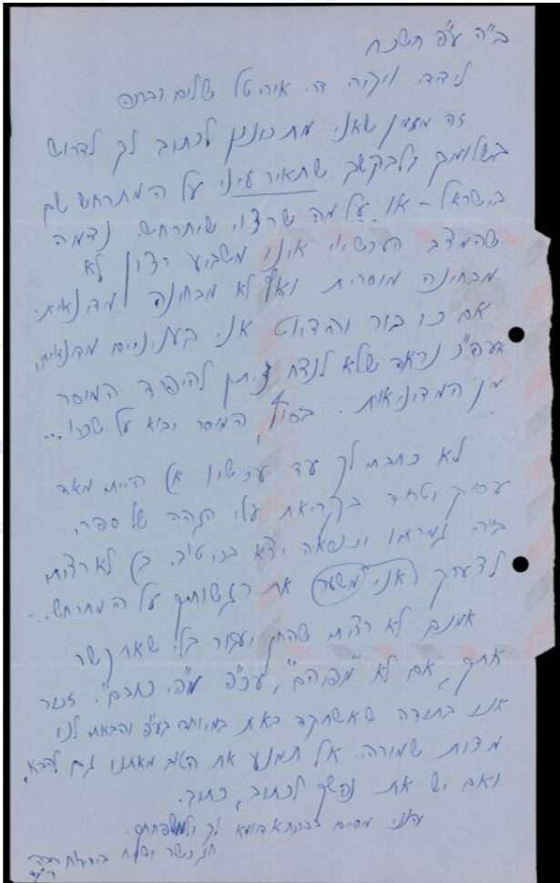 זוכר אני בתודה, שאשתקד באת במיוחד בע”פ [בערב פסח] והבאת לנו גם מצות שמורה. אל תמנע את הטוב מאתנו גם להבא. ואם יש את נפשך לכתוב, כתוב.