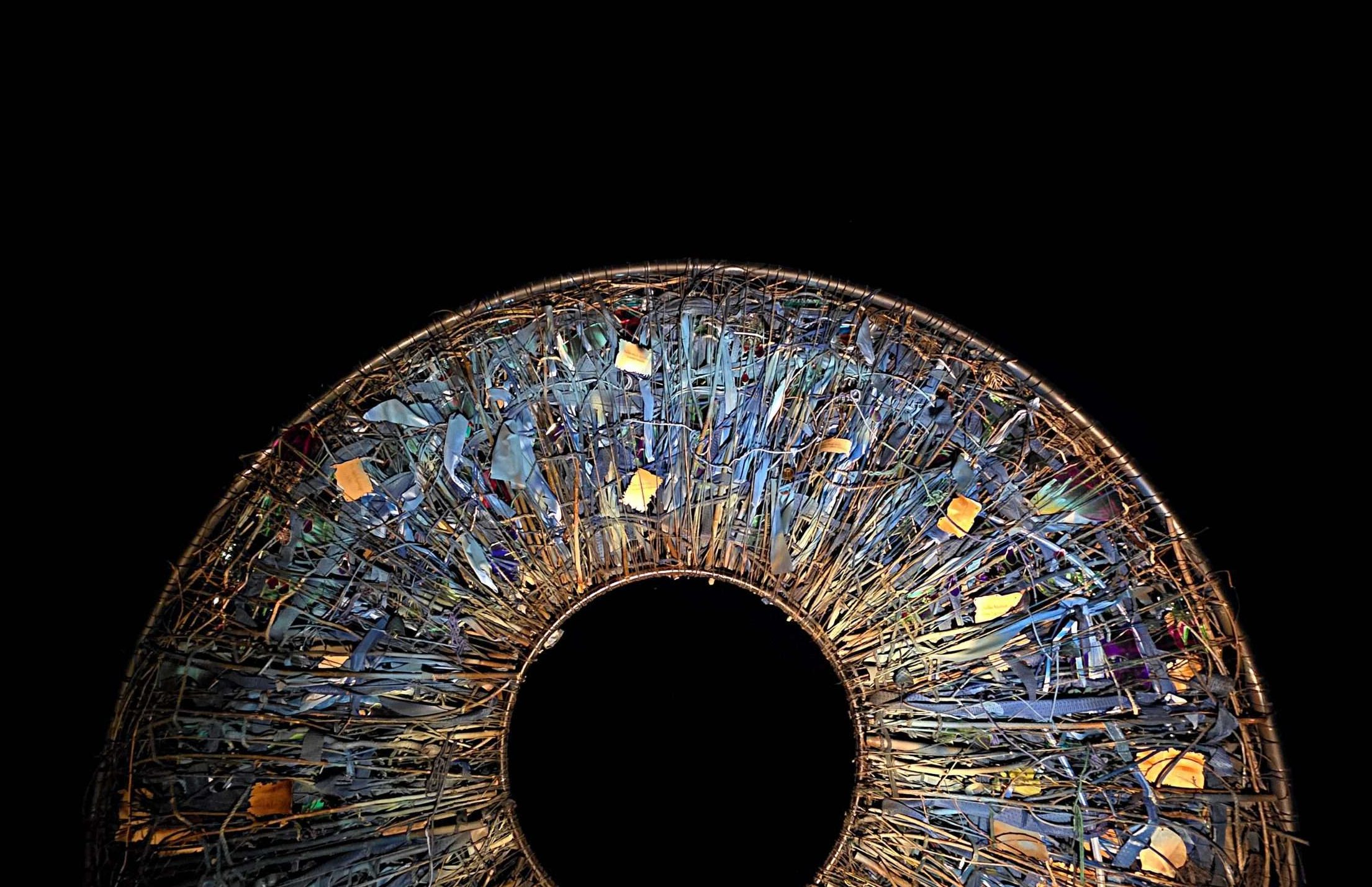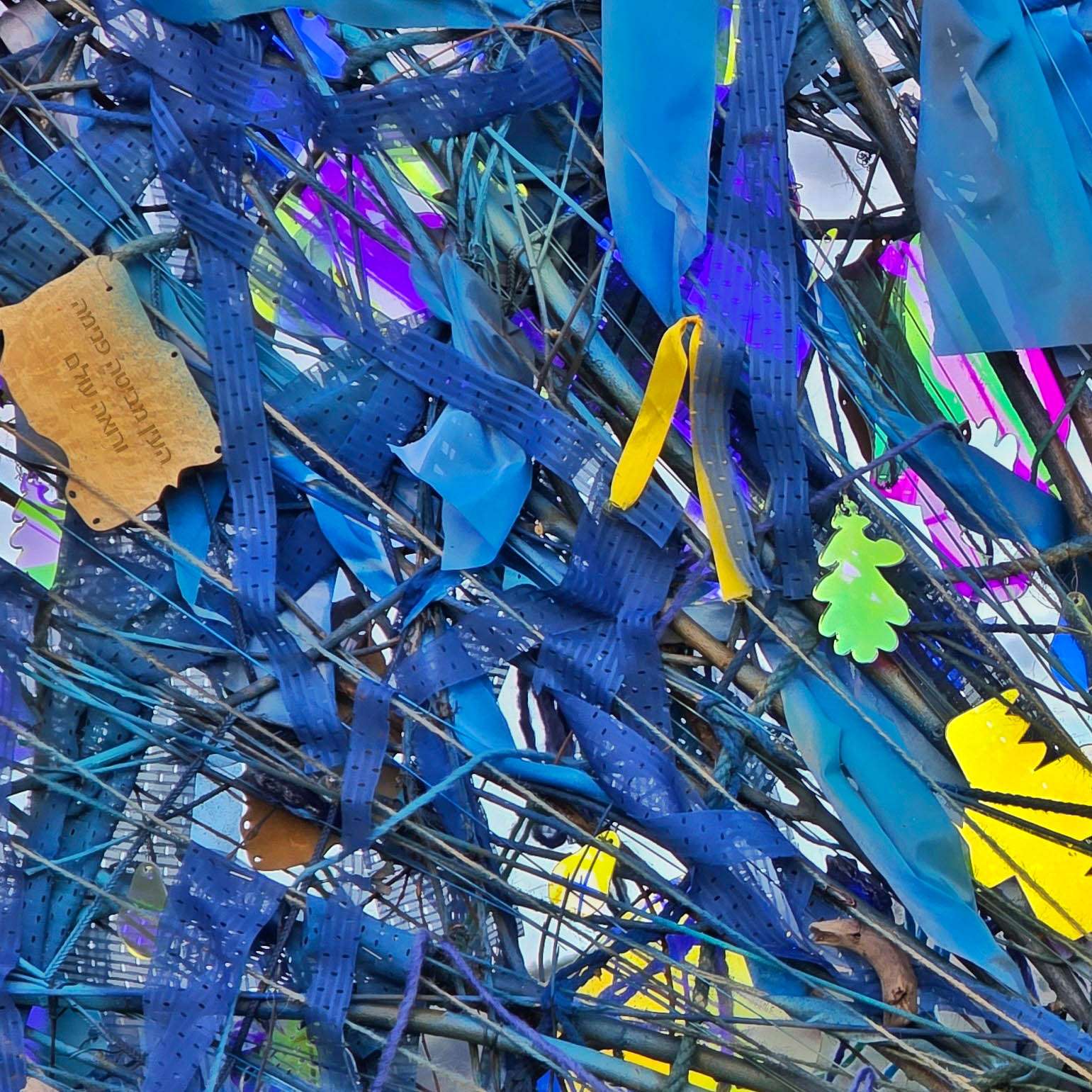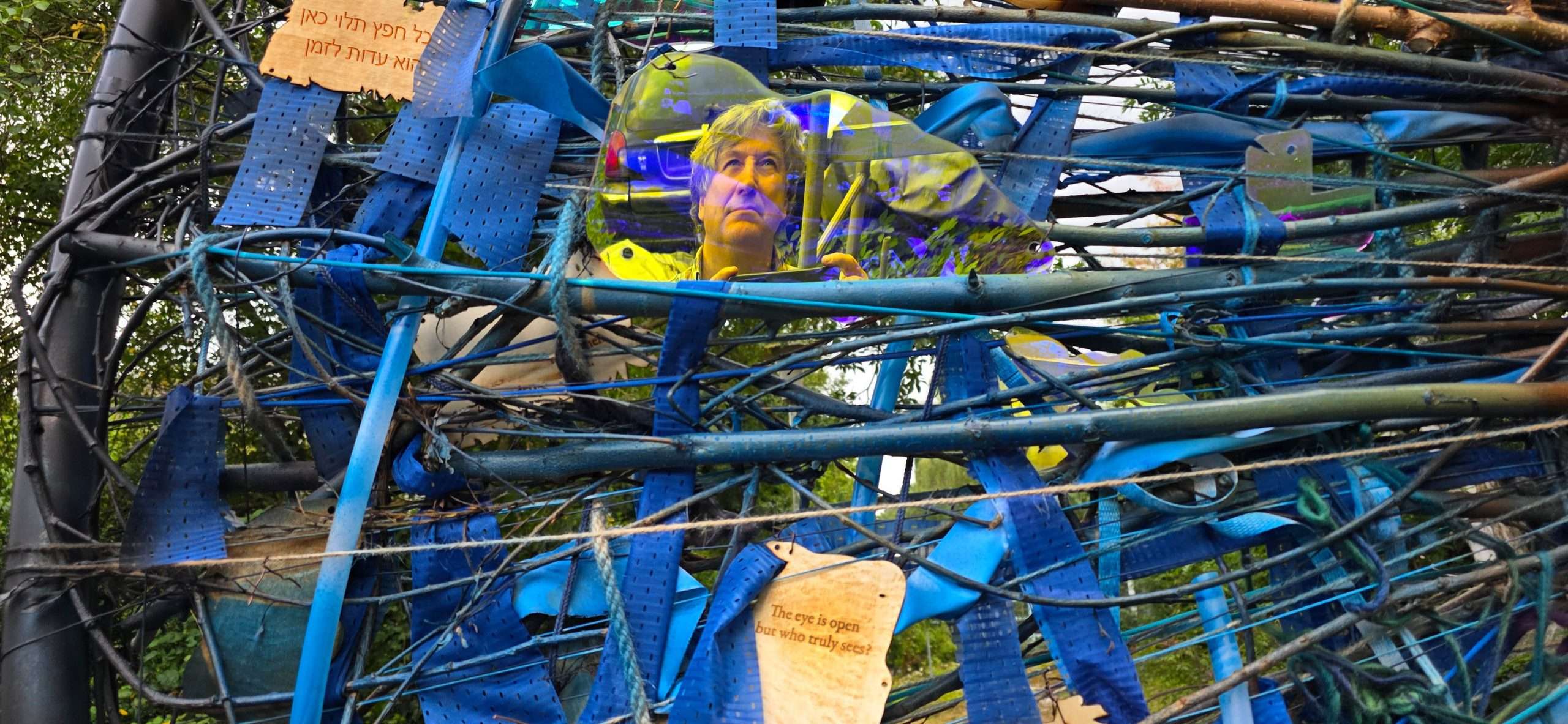 עץ חרוט, זכוכית שבורה, חפצים אסופים, חוטי ברזל. כל חומר כאן הוא עדות. כל פרט משיב את האור אחרת.