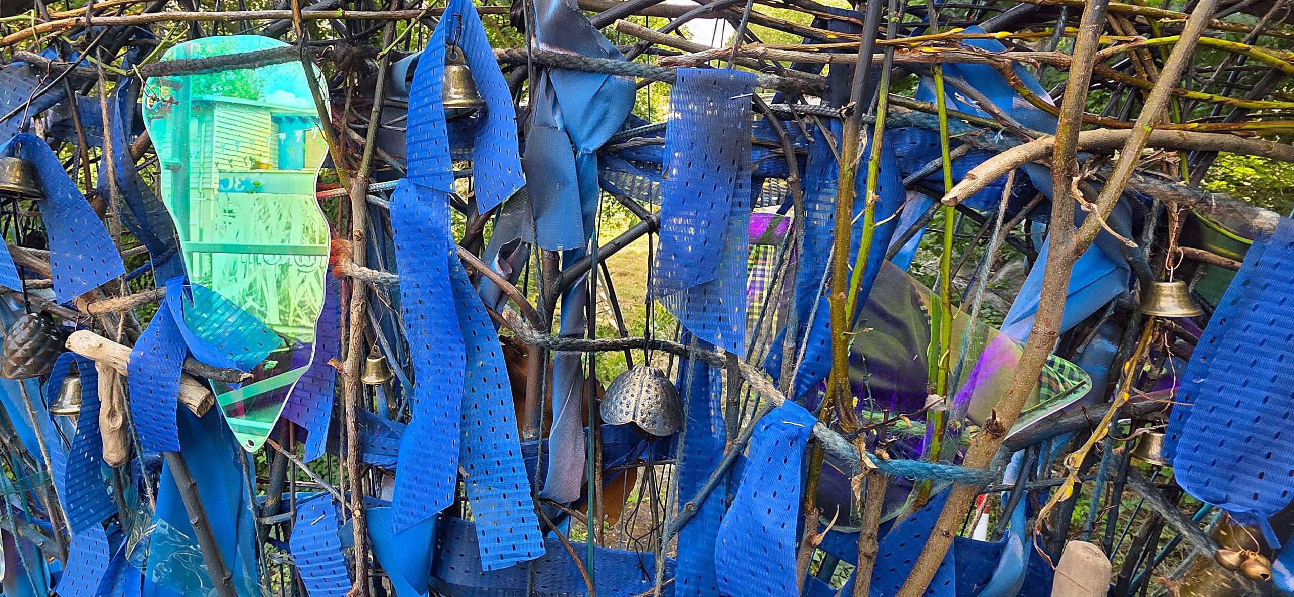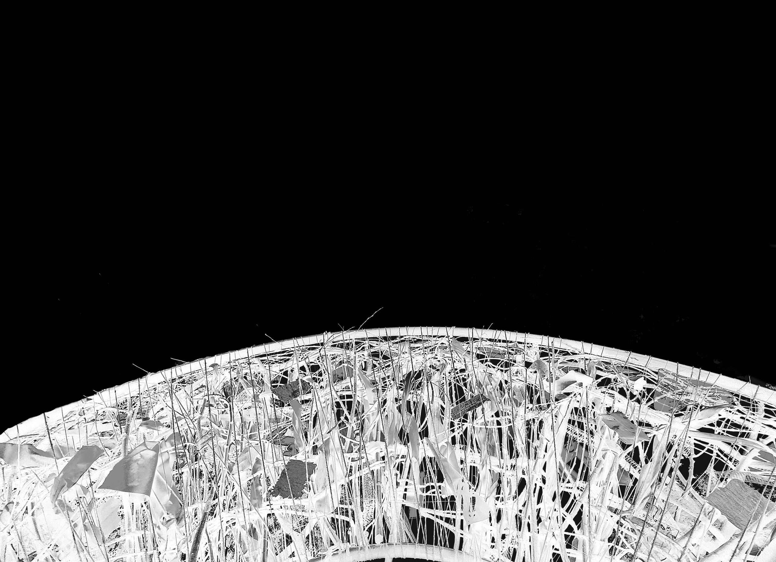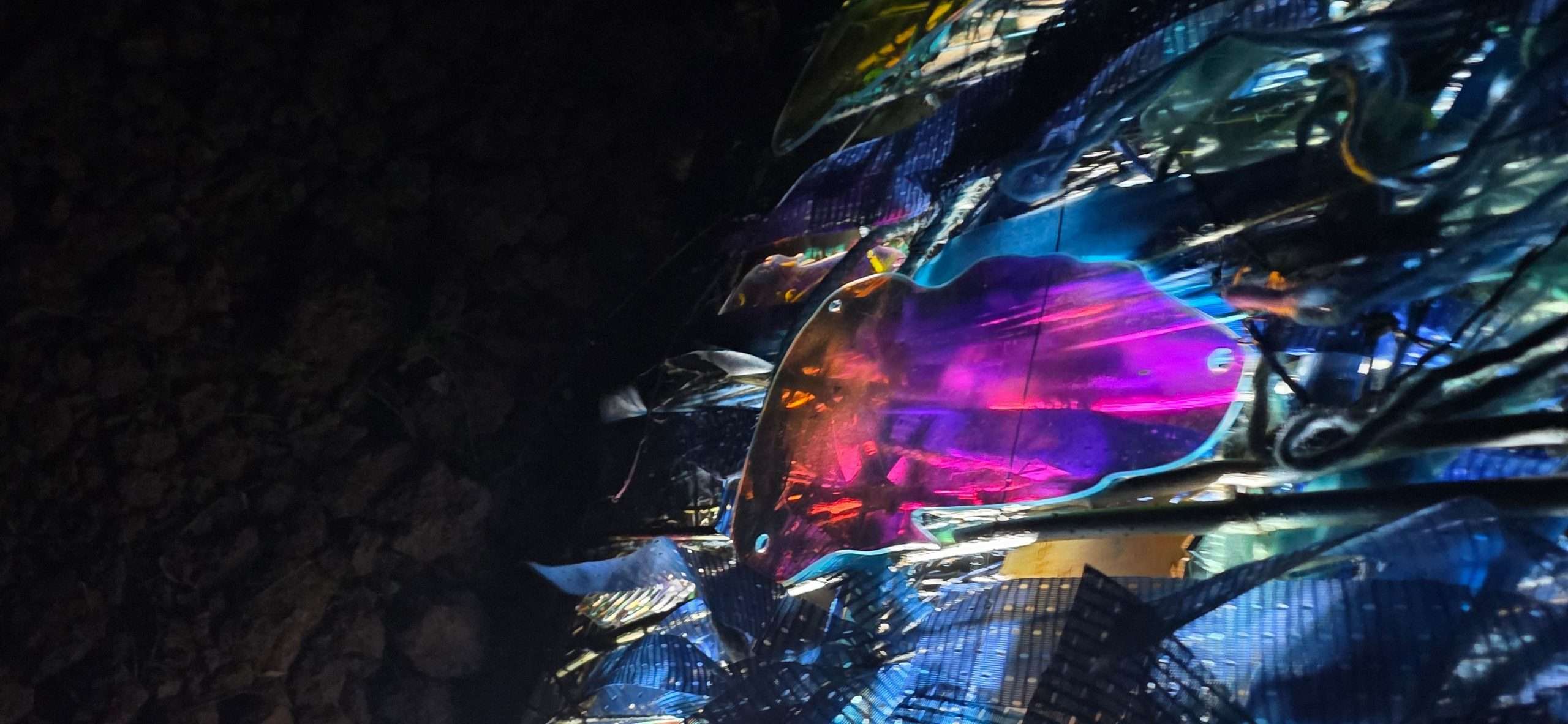 עץ חרוט, זכוכית שבורה, חפצים אסופים, חוטי ברזל. כל חומר כאן הוא עדות. כל פרט משיב את האור אחרת.